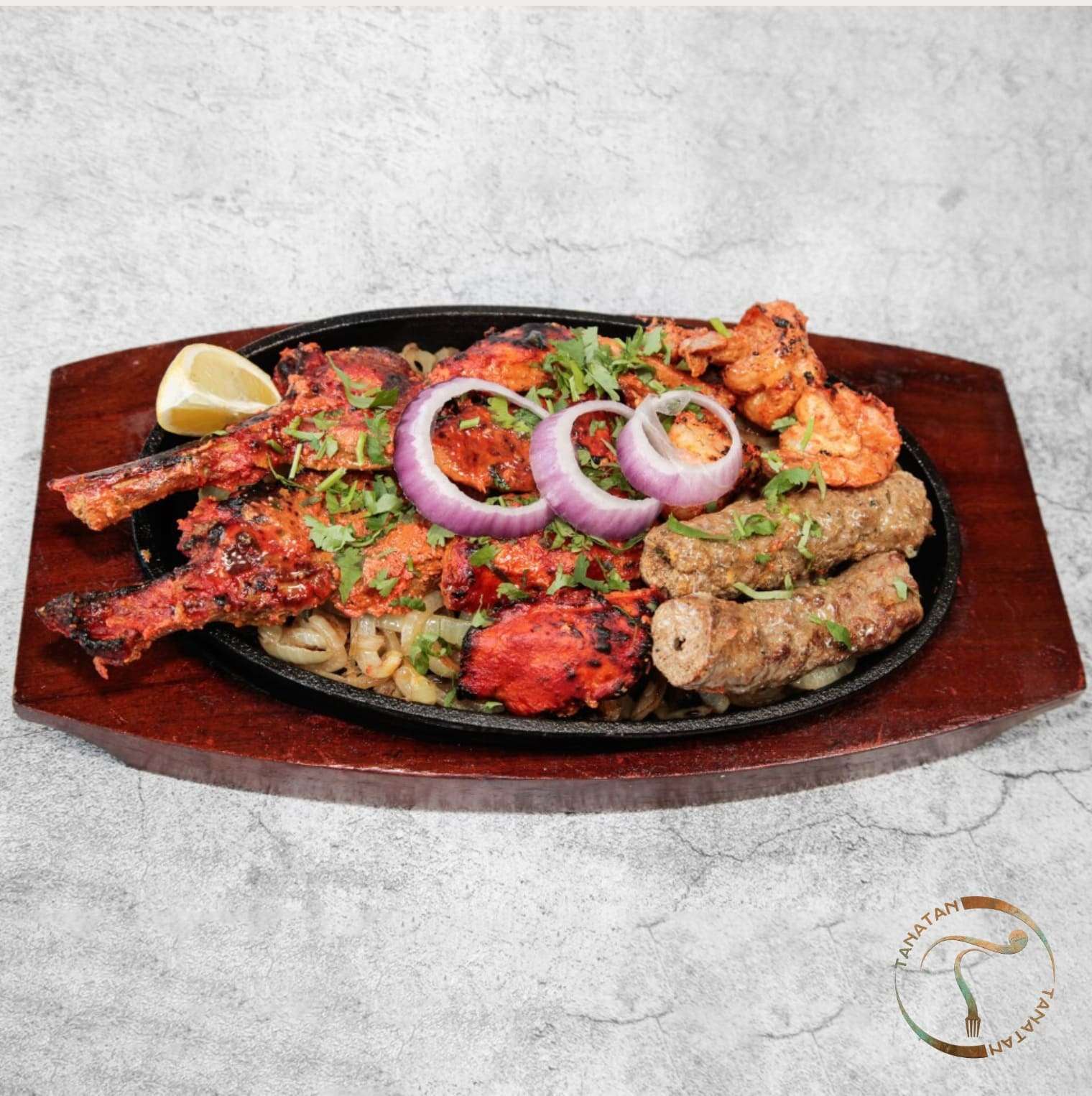 A combo tandoori platter of chicken tikka 4pieces, lamb chops 2pieces, prawns 4pieces and seekh kebab 2pieces. All sizzling sizzlers are served on a hot sizzling plate over a bed of caramelized onion.